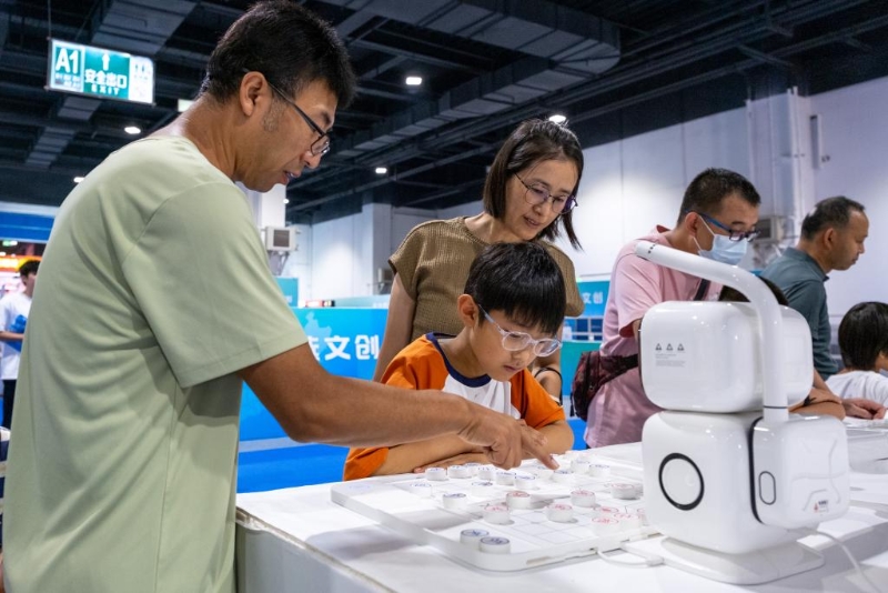 在2025北疆書(shū)展現(xiàn)場(chǎng),參會(huì)者與AI下棋機(jī)器人對(duì)弈。新華社記者 馬金瑞 攝